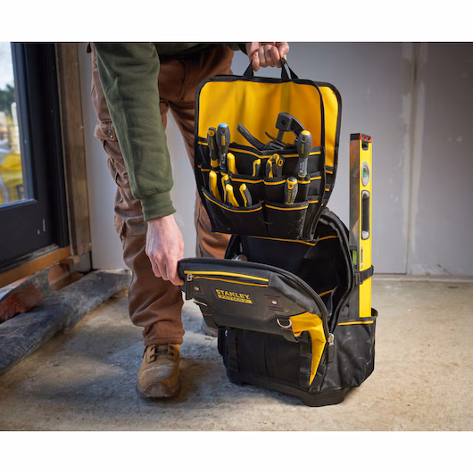 The STANLEY® FATMAX® Heavy-Duty Tool Bag Backpack features a wide opening zip design for quick and convenient access to tools, and includes a rigid waterproof base for durability. The backpack has two padded shoulder straps which provide comfort whilst carrying heavy loads, as well as a removable tool organiser with a carry handle for organisation of small tools. There are also multiple pockets including a padded compartment for a laptop or tablet and a zip compartment for personal items. Long tools such as spirit levels can be carried in the helpful tool loop. Made from heavy duty 600 denier fabric for long lasting durability.
