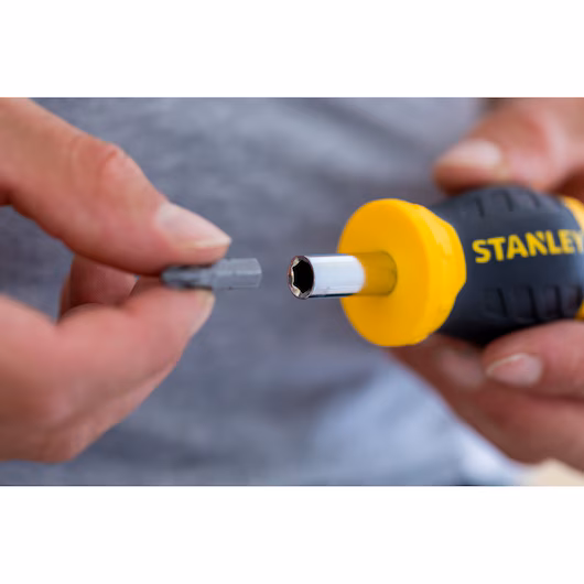 The STANLEY® Ratchinging Screwdriver Subby Multibit – 6 Bits, is durable and is suitable for narrowed access. Has a magnetic bit holder for efficient holding and rapid changing of the bit. The Bi-material handle gives extra grip. Internal bit storage for easy access and fast changeover of bits. Has magnetic tip and a twist off cap. Supplied with x6 screwdriver bits (PH1-PH2, PZ1-PZ2, Flared 4.5-6 mm).